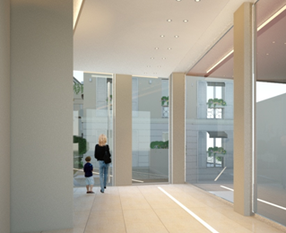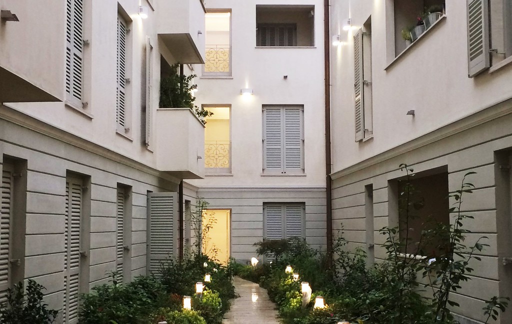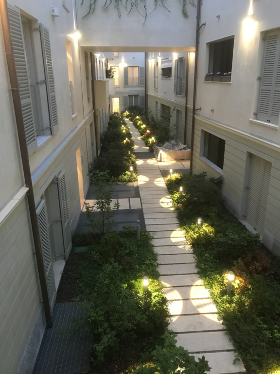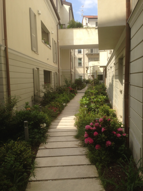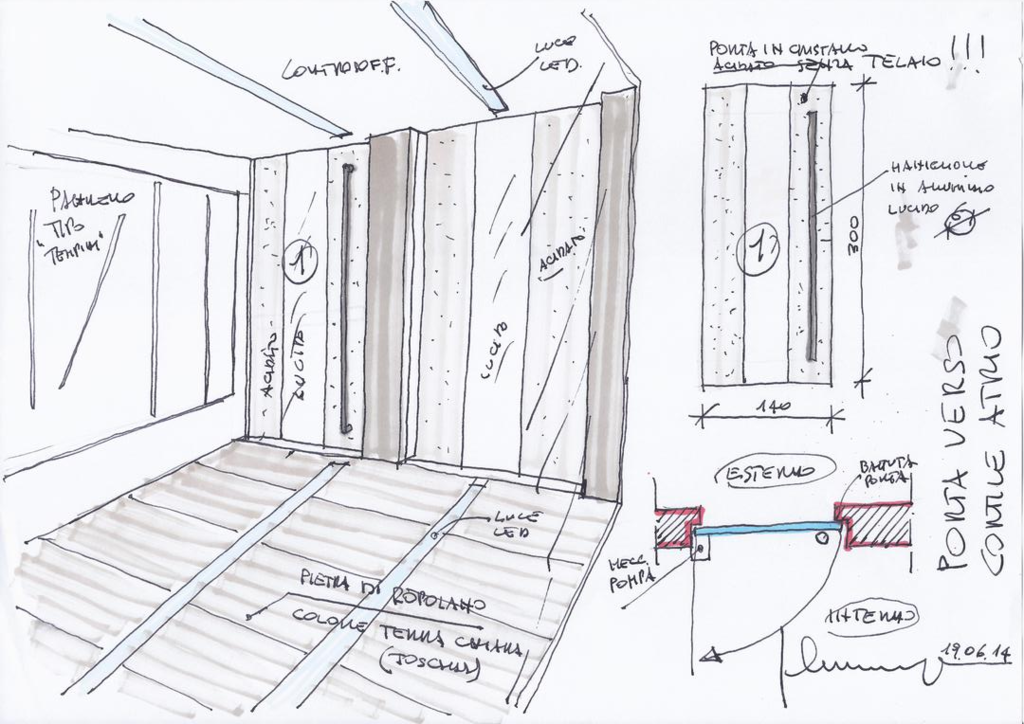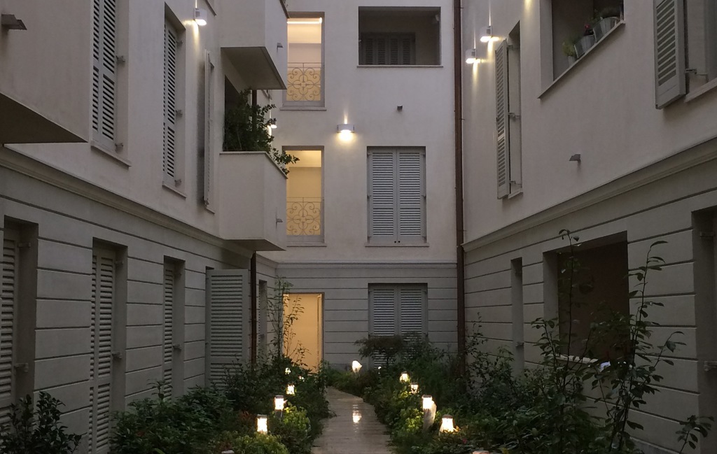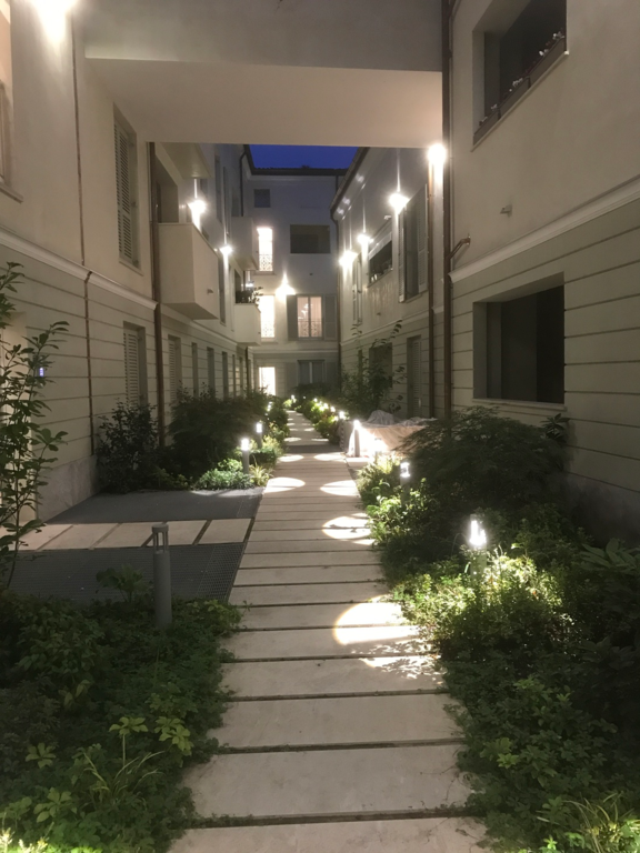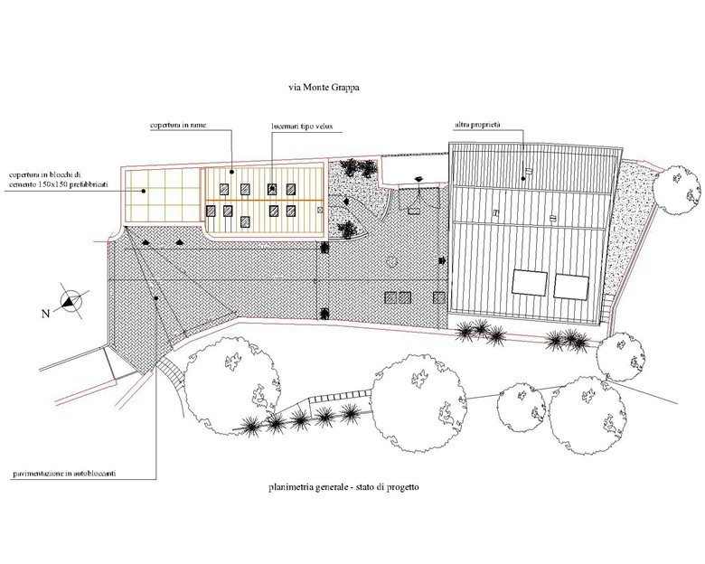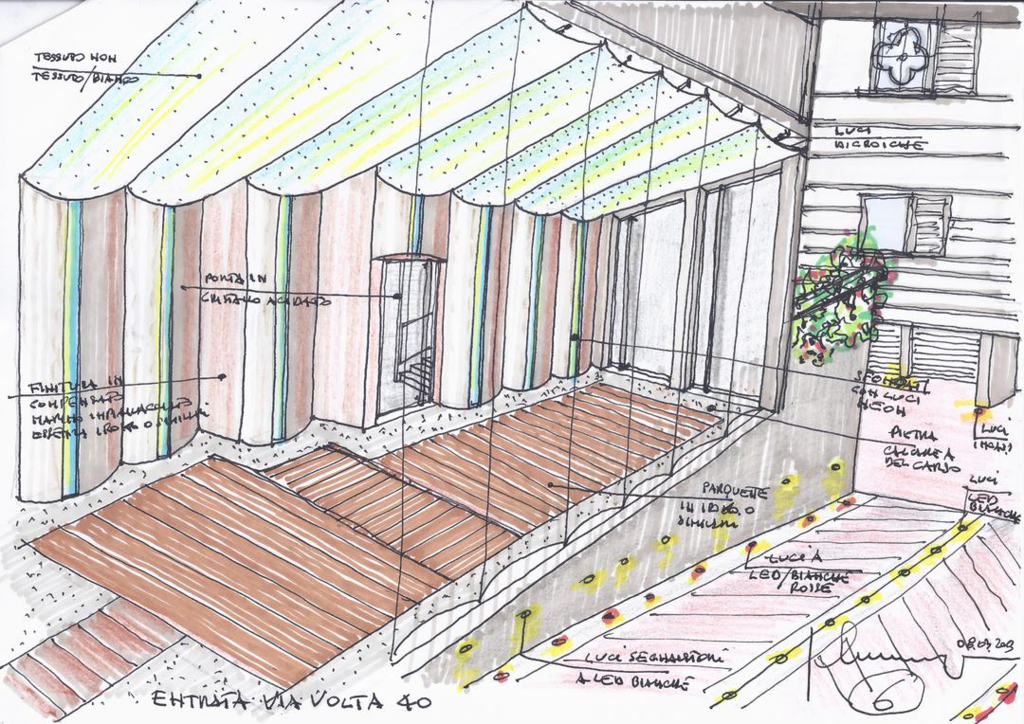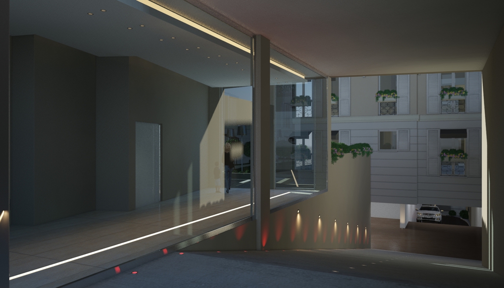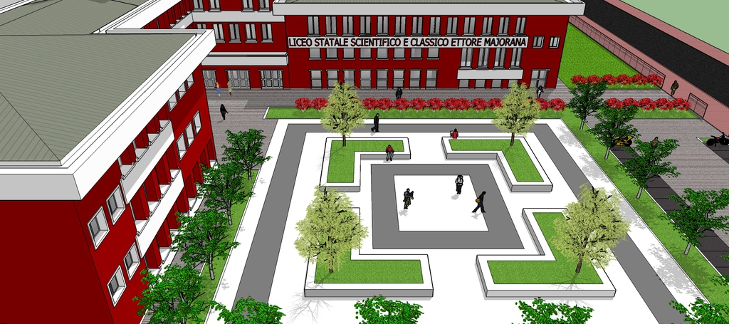 Lo spazio è definito attraverso la successione degli elementi d’arredo del cortile, intesi come definizione gerarchica delle esigenze funzionali in un unico spazio. La forma quadrata del cortile, segue regole e logiche dettate dalla funzionalità degli spazi in pianta e in alzato. La percezione dello spazio cambia dunque sulla base di un impianto semplice e chiaro. Ad esempio, l’ingresso principale scorre su una corsia posta lungo la parete esistente e ridefinisce il percorso verso l’effettivo ingresso all’edificio. Uno spirito minimale e razionale anima tutto il progetto e così il percorso funzionale che delinea la direzione...